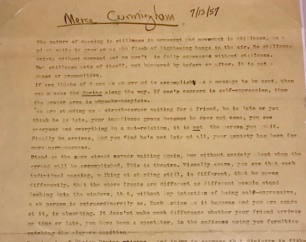 The nature of dancing is stillness in movement and movement in stillness, as a plant waits to grow or as the flash of lightning hangs in the air. No stillness exists without movement and no movement is fully expressed without stillness. But stillness acts of itself, not hampered by before or after. It is not a pause or premonition.